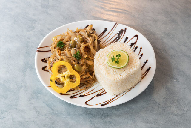 Sauce à l'oignon, moutarde, olive et carotte. Servi avec riz.